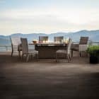 Italian Husk Halstead 7-Piece Dining Set with Fire Element is the ideal addition to your outdoor space, providing comfortable seating for six. This set includes two dining chairs with arms, four sleek armless dining chairs, and a spacious aluminum dining table. Part of the exclusive Halstead collection, it features a large fire element with stunning shattered fire glass, all while maintaining the clean, modern lines that define this collection’s transitional style.