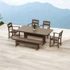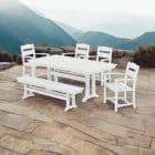 This durable set can withstand year-round outdoor conditions, from intense sunlight to heavy rain, without requiring additional storage space or covers. UV protectant and pigments are embedded throughout the HDPE material, eliminating the need for painting or waterproofing. Featuring marine-grade quality hardware, the Polywood Dining Set is made in the USA. The set includes four Polywood Dining Arm Chairs, one Farmhouse Trestle 65" Bench, and one Farmhouse Trestle 37" x 72" Dining Table.