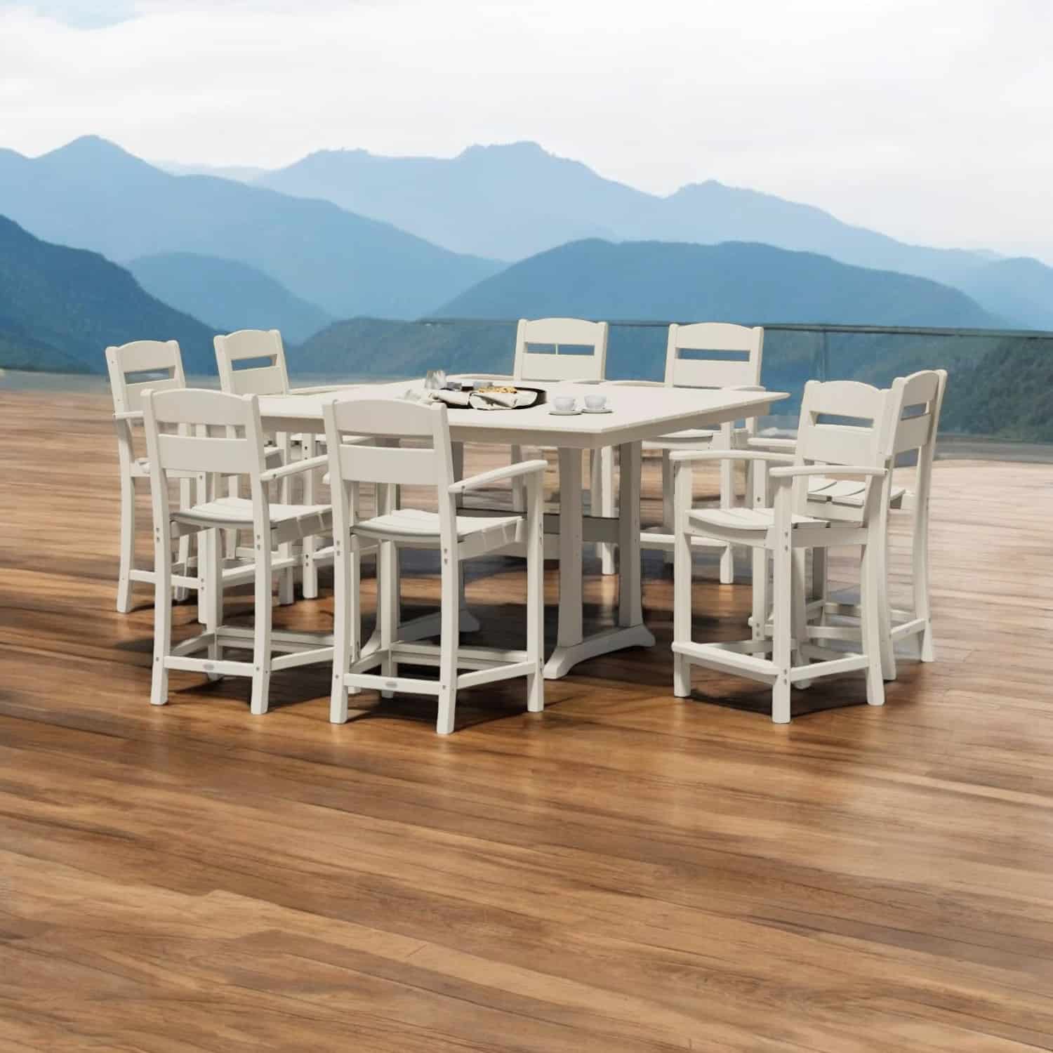 Chairs are weight-tested up to 350 lbs. Embrace effortless outdoor living with the Polywood Sunbrella 9-Piece Counter Set, blending style, comfort, and durability seamlessly.