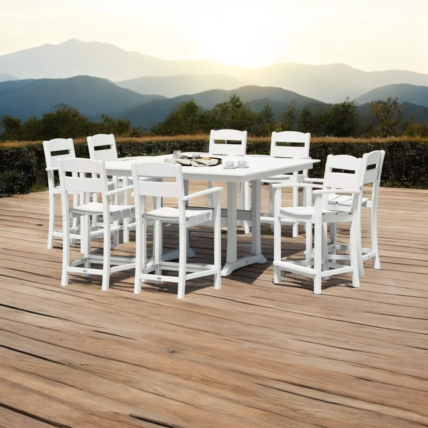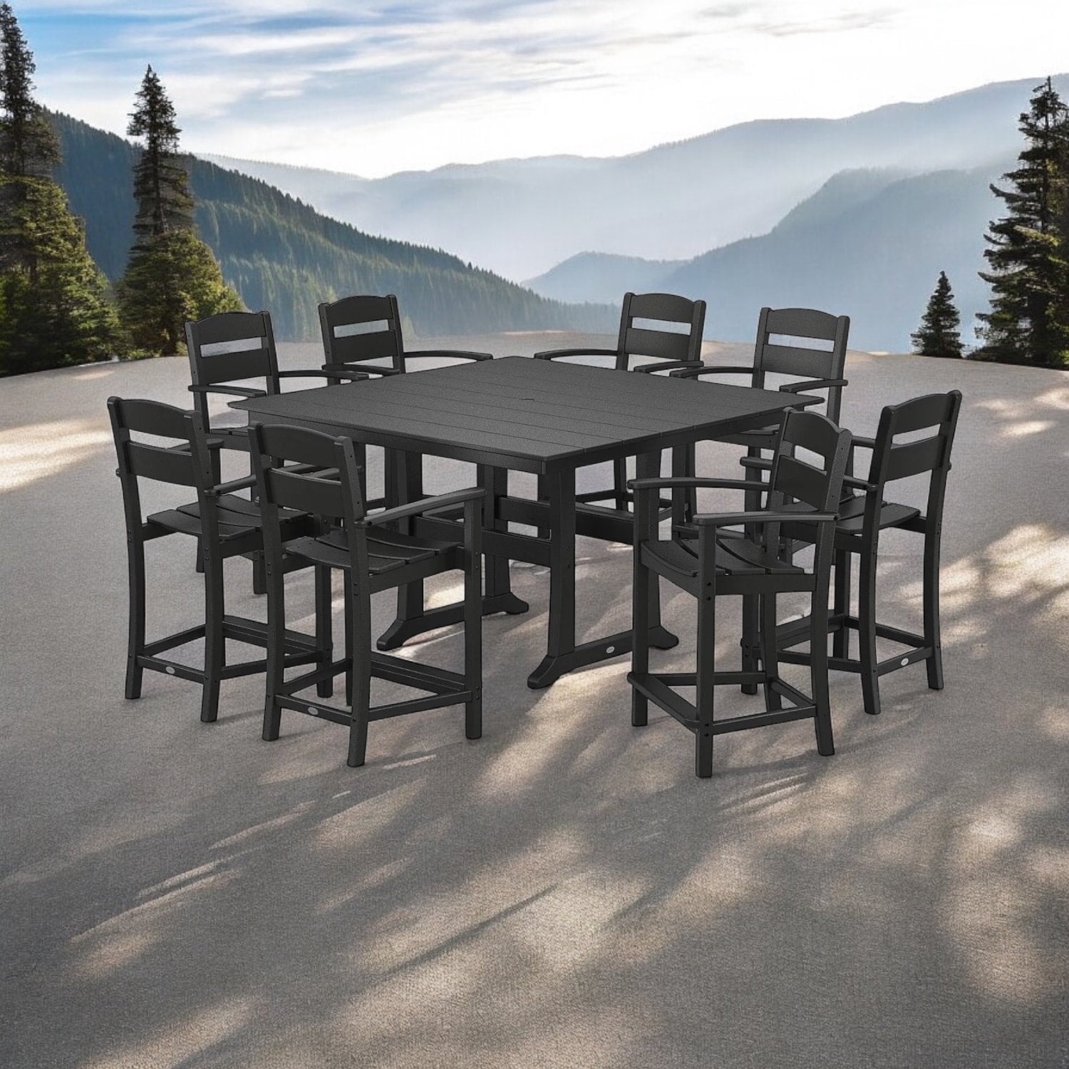Gather with family or friends around the Polywood Sunbrella 9-Piece Counter Set. This set offers versatile and comfortable seating, perfect for serving your favorite recipes, refreshing beverages, and delectable desserts. The table features a spill-resistant and stain-proof surface, ideal for any gathering, and includes an integrated umbrella hole to easily adjust the amount of sun or shade.