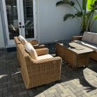 Elevate your outdoor ambiance with the Summit Breeze 4-Piece Deep Seating Set with Fire Pit. This handwoven all-weather wicker set includes a comfortable sofa, two swivel glider motion chairs, and a versatile fire pit coffee table. Plush seat cushions enhance the comfort of this stylish, contemporary ensemble, perfect for refreshing your outdoor space.