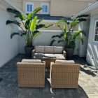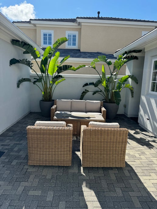 The chairs and sofa feature fade-resistant all-weather wicker, handwoven with a natural grass weave look and multi-textural appeal. Plush seat cushions, upholstered in Sunbrellaยฎ fabric provides luxurious comfort and timeless elegance. Designed for lasting enjoyment, the Summit Breeze set promises years of outdoor dining and entertaining with family and friends.