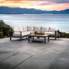 Elevate your outdoor space with the Modern Vista 5-Piece Sectional Set, designed to bring contemporary flair and comfort to your patio. This set features stylish and comfortable seating along with a sleek coffee table. Crafted with FSC-Certified teak wood for a warm and natural aesthetic, the tabletop and armrests add a touch of sophistication. Laser weld construction ensures durability and strength, promising years of enjoyment.