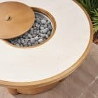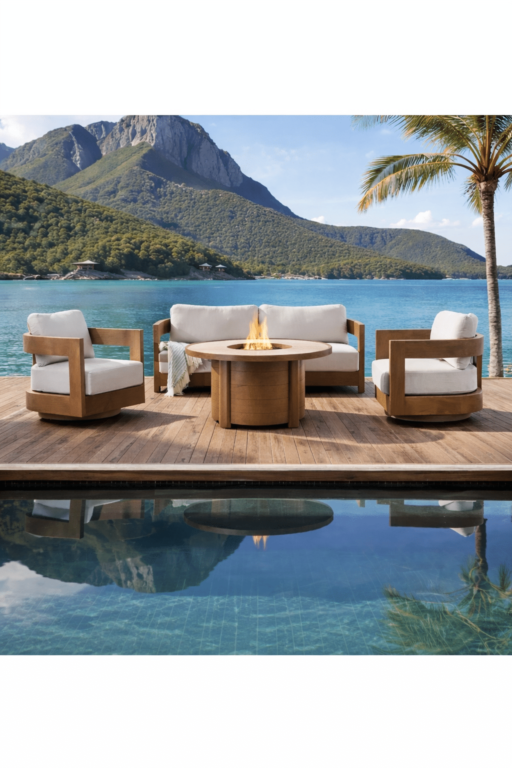 This four-piece seating set includes two 360-degree swivel chairs, a spacious sofa, and a coordinating fire table that anchors the space beautifully. The porcelain tabletop adds a clean, sophisticated finish, while the adjustable flame creates a warm and welcoming atmosphere for evenings outdoors.